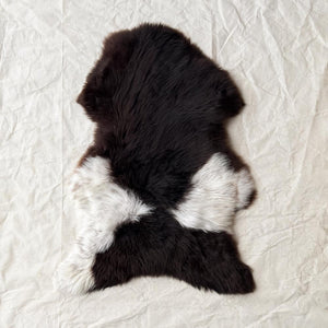 Unique, undyed Jacob sheepskin with natural colour pattern as shown in the photos – this huge, deep, soft dark chocolate and silvery white fleece is the specific one you will receive.