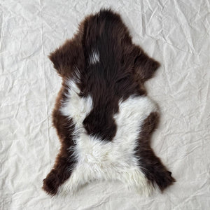 Unique, undyed Jacob sheepskin with natural colour pattern as shown in the photos – this dark chocolate fleece with cream flashes is the specific one you will receive.