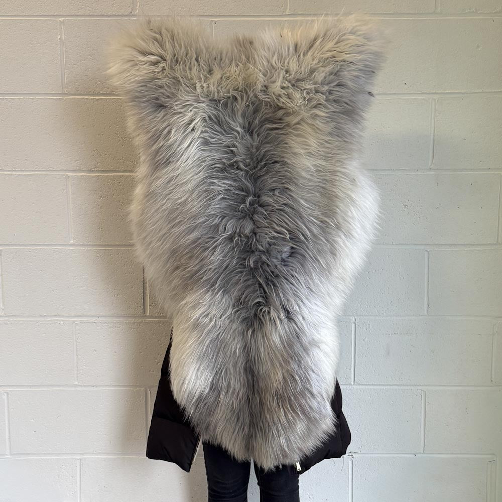 Unique, undyed Icelandic sheepskin with natural colour pattern, as shown in photographs - this beautiful silver sheepskin with smoke grey and white highlights is the specific one you will receive.